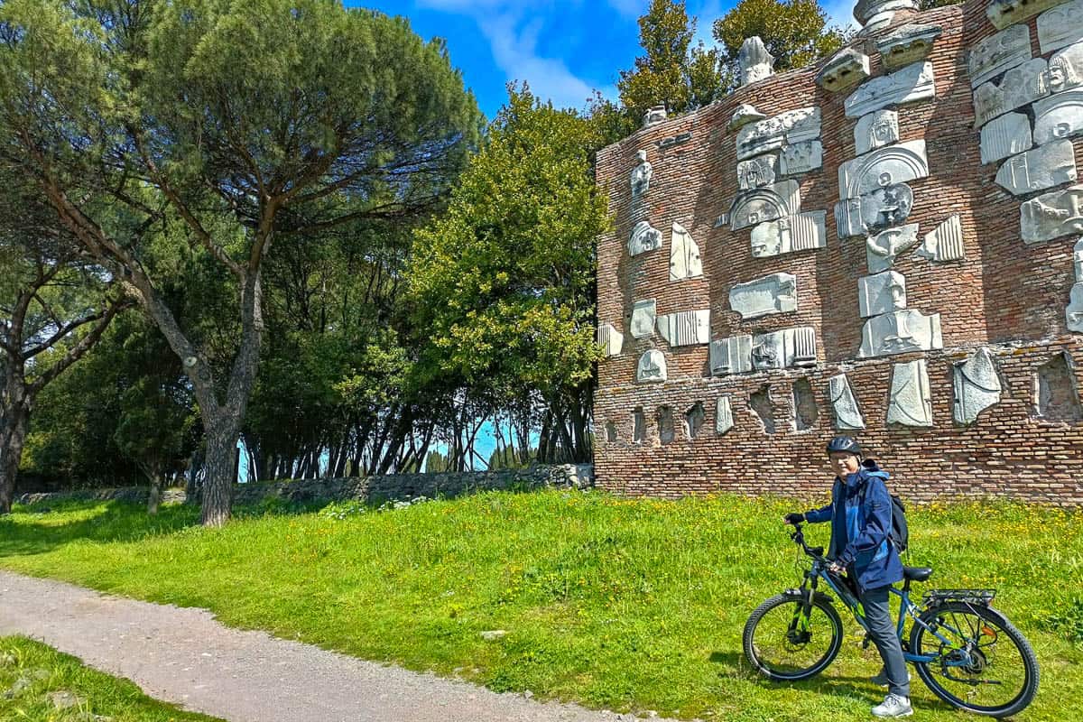 Una bici elettrica, utile su un selciato (il basolato romano) ricco di asperità, mi porta sui 17 km di un tracciato fortemente consigliabile, un vero museo all’aperto, un luogo unico al mondo dove la Storia si confonde con la natura.