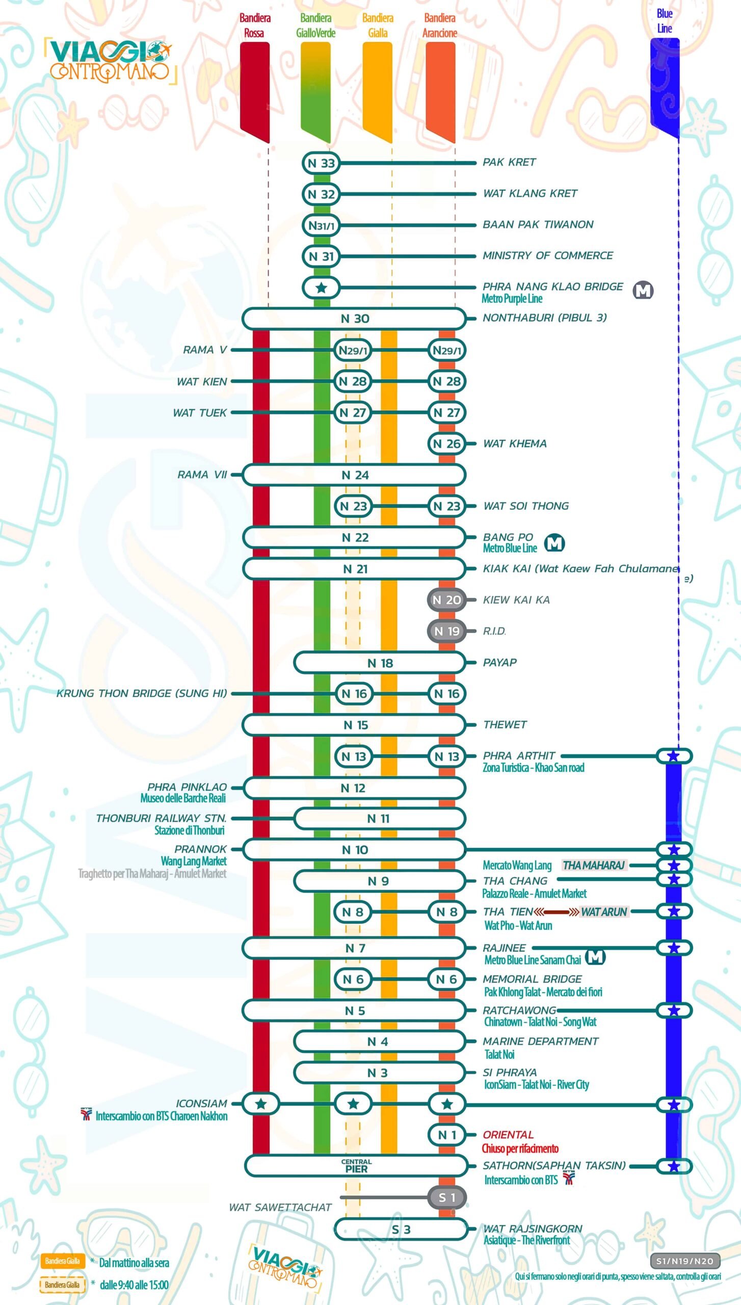 - I moli che si trovano sul fiume Chao Phraya a nord di Sathorn sono contrassegnati dalla Lettera N seguita dal numero, mentre i moli che si trovano a sud di Sathorn sono segnati con la Lettera S seguiti dal numero.