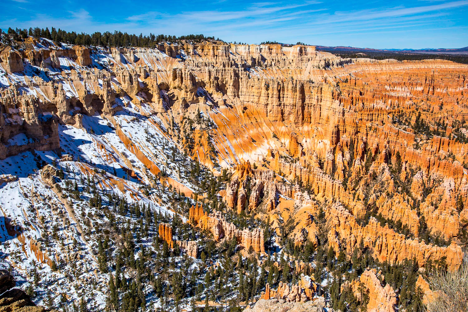 Bryce Canyon durante i mesi invernali, il parco è in genere coperto di neve e molto spettacolare. Durante l’inverno il parco rimane ancora aperto e attira molti visitatori per le attività invernali, come le gite con le ciaspole lungo il Navajo trail o semplicemente per fotografare i pinnacoli innevati. La temperatura più bassa registrata nel parco è stata di -32° C nel 1963, meglio partire preparati.