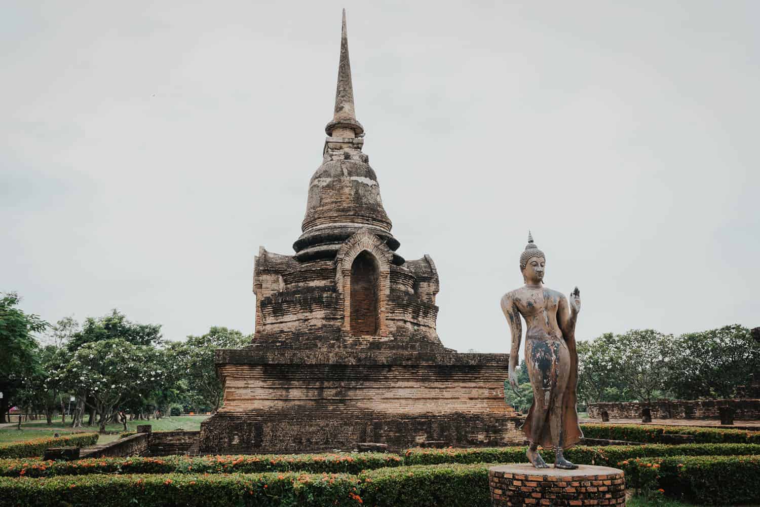 Le statue del Buddha che cammina sono più comuni nell’arte thailandese, soprttutto del periodo Sukhothai, dove questa rappresentazione è particolarmente apprezzata. Un esempio famoso è la statua del Buddha che cammina nel Parco Storico di Sukhothai in Thailandia. In queste statue, il Buddha è spesso raffigurato con una mano alzata in un gesto di benedizione o rassicurazione, mentre l’altra mano può essere rilassata lungo il corpo o tenere un lembo della veste.