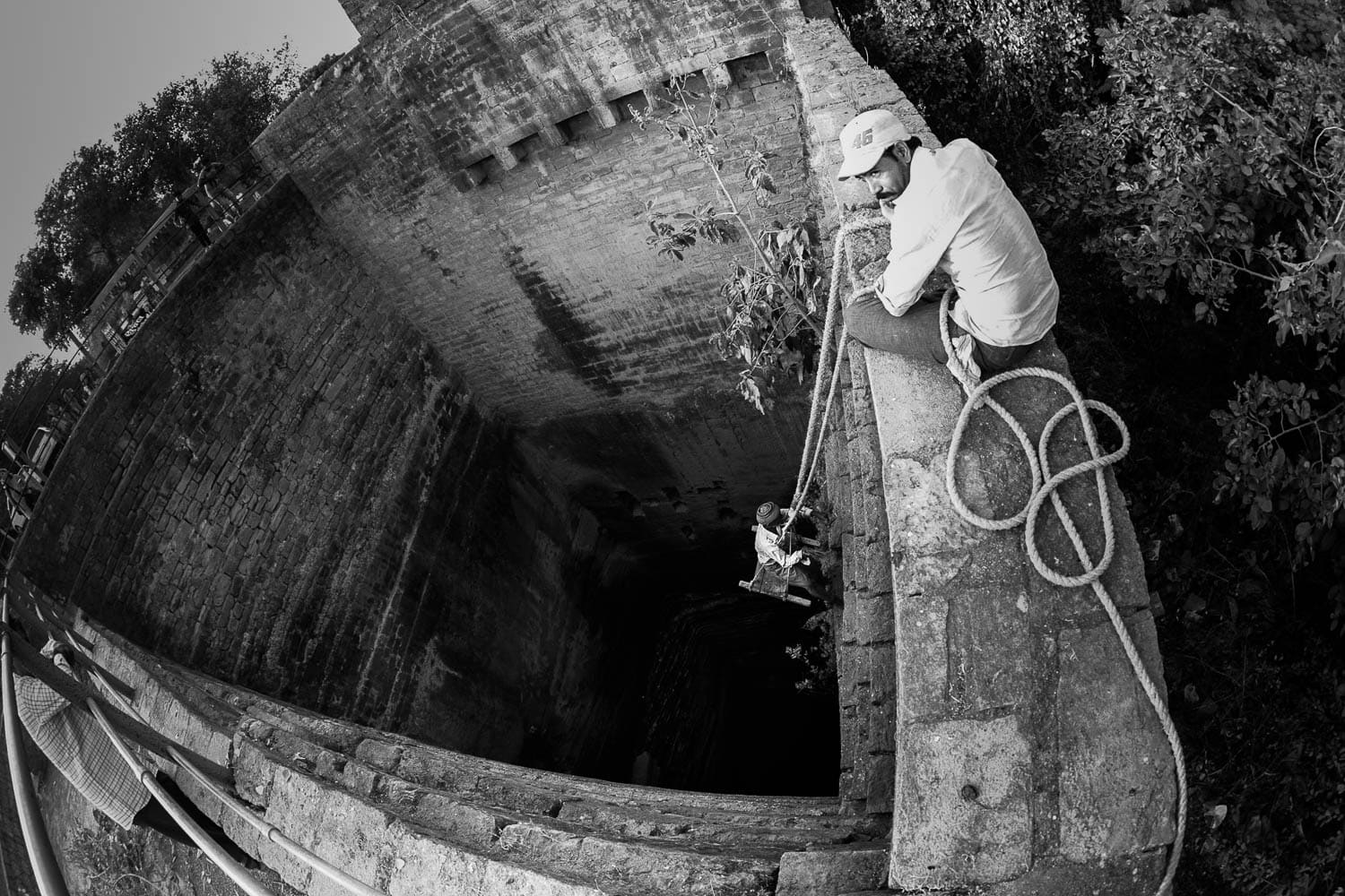 La mia attenzione in questo caso viene attirata dagli addetti ai lavori di pulitura. Il pozzo era accessibile tramite una scala intagliata in una profonda gola di roccia (foto a fondo pagina), mentre gli addetti pulivano una parte visibile ma non accessibile.